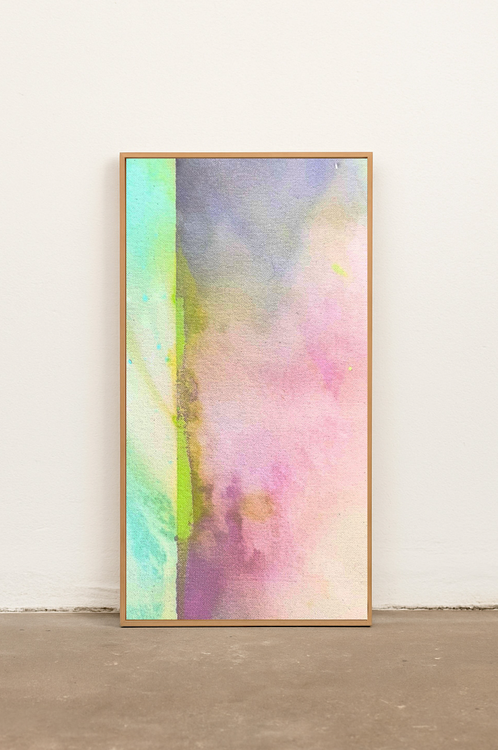 Crafted with acrylic and ink on hand-stretched cotton canvas, its surface reveals translucent layers that hover between warmth and coolness, echoing the subtle tension of a space not yet closed. Finished with archival varnish for protection and longevity.