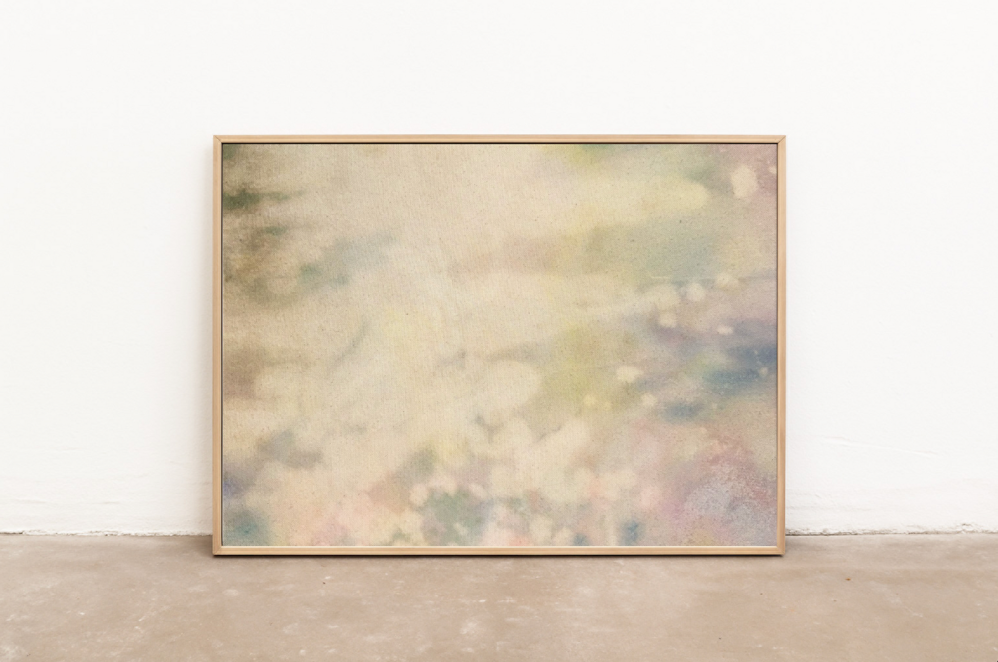 Visually, soft tones of ivory, blush, moss, and pale blue dissolve across the surface, evoking morning mist or clouds meeting ocean light. Crafted with acrylic and ink on hand-stretched cotton canvas, the piece glows with quiet luminosity and delicate motion. Finished with archival varnish for protection and longevity.